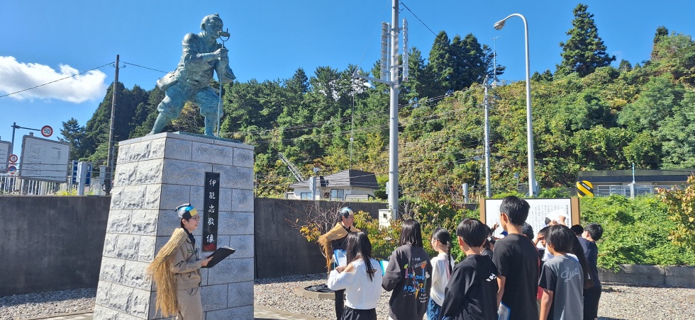 後半は伊能忠敬北海道測量開始記念公園の伊能忠敬像の下で解説しました。