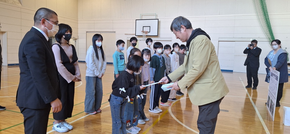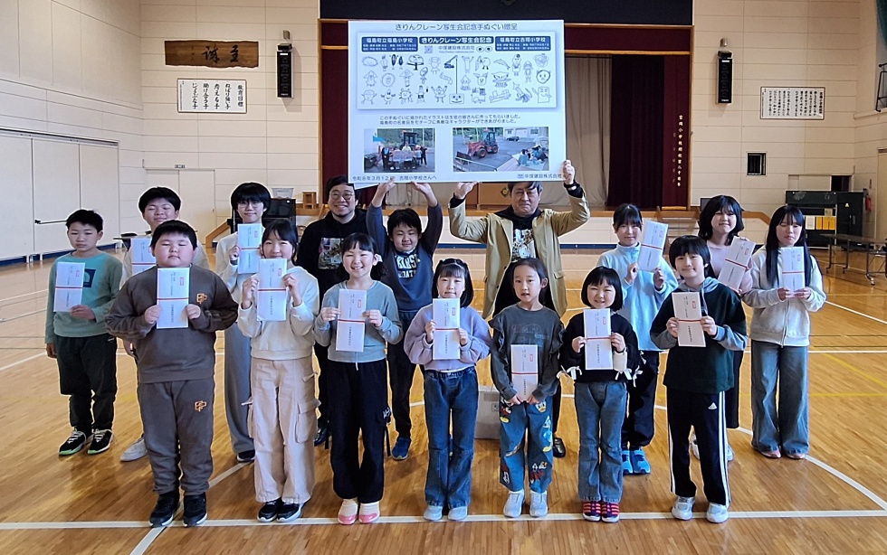 2つの福島町立小学校にきりんクレーン写生会記念手ぬぐいを贈呈しました。