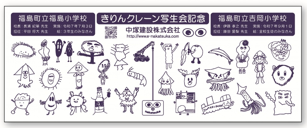 この手ぬぐいは令和7年に実施したきりんクレーン写生会を記念し、写生会に参加してくれた児童を中心にイラストを制作してもらい、プリントしたものです。
